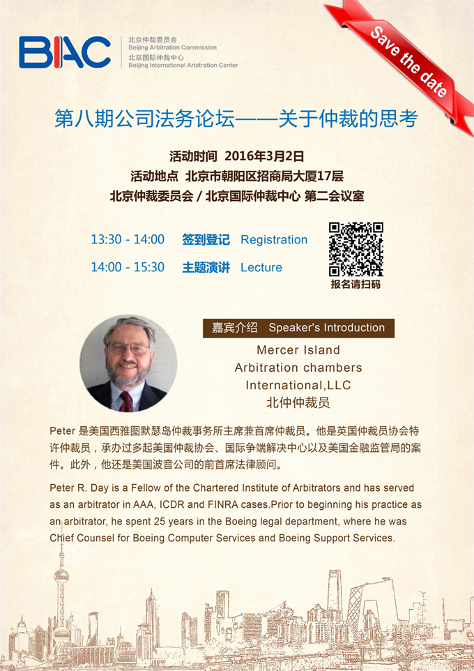 北京仲裁委员会第八期公司法务论坛将于2016年3月2日下午在北京市朝阳区招商局大厦17层 北京仲裁委员会/北京国际仲裁中心 第二会议室举办关于仲裁的深度探讨分享活动。
