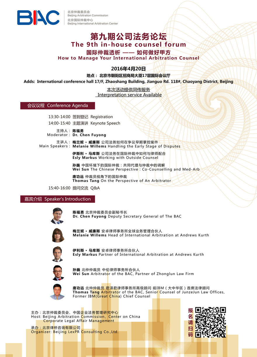第九期公司法务论坛将于2016年4月20日下午13:30在北京市朝阳区招商局大厦17层 北京仲裁委员会/北京国际仲裁中心国际会议厅举行。