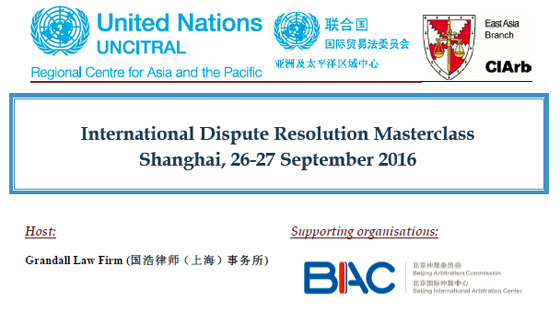 北京仲裁委员会/北京国际仲裁中心很高兴支持联合国国际贸易法委员会亚洲及太平洋区域中心(United Nations UNCITRAL Reginal Centre for Asia and the Pacific)、英国御准仲裁员协会东亚分会(Chartered Institute of Arbitrators East Asia Branch)、国际争议解决学会(International Dispute Resolution Academy)将于2016年9月26日至27日在中国上海举办国际争议解决业务培训活动(International Dispute Resolution Masterclass)。