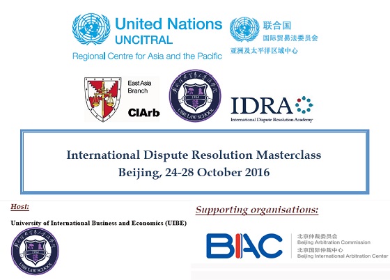 北京仲裁委员会/北京国际仲裁中心很高兴支持联合国国际贸易法委员会亚洲及太平洋区域中心(United Nations UNCITRAL Reginal Centre for Asia and the Pacific)、英国御准仲裁员协会东亚分会(Chartered Institute of Arbitrators East Asia Branch)、对外经济贸易大学(University of International Business and Economics)、国际争议解决学会(International Dispute Resolution Academy)将于2016年10月24日至28日在中国北京举办国际争议解决业务培训活动(International Dispute Resolution Masterclass)。