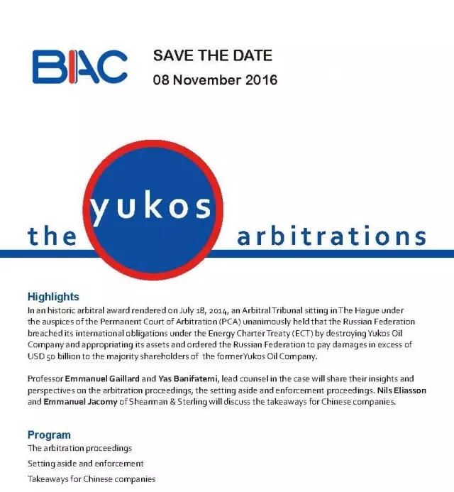 Emmanuel Gaillard教授以及Yas Banifatem博士是代理尤科斯石油公司仲裁案的主办律师。他们将分享对这宗仲裁案中的仲裁程序、撤销和执行程序的见解和观点。谢尔曼•思特灵(Shearman&Sterling)律师事务所的Nils Eliasson 博士和Emmanuel Jacomy律师亦将讨论中国企业能够从尤科斯仲裁案中吸取的经验。