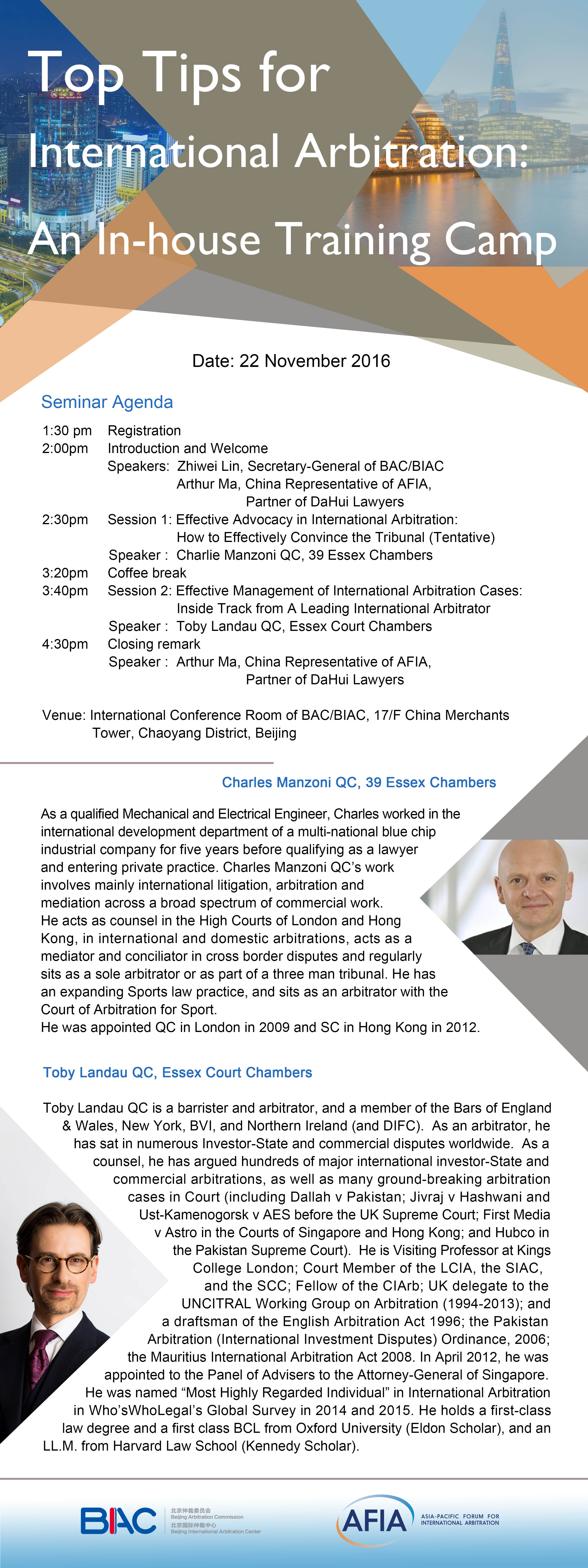 本次研讨会由北京仲裁委员会与亚太国际仲裁论坛联合主办。届时,各位参会人员将有机会听取两位国际仲裁界重量级英国御用大律师Toby Landau 先生及Charlie Manzoni先生详细介绍如何有效在国际仲裁中进行抗辩和程序管理。