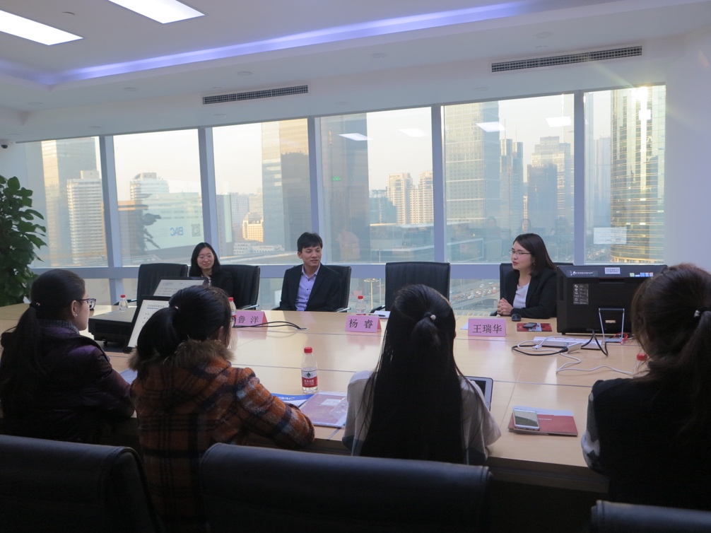 学生代表团首先观看了本会以“铸造公信力”为题的视频短片,对北仲的发展历程、理念和特色有了直观的认识。随后,北仲知识管理高级主管、法大校友王瑞华向代表团简要介绍了商事仲裁的概念、特点及商事仲裁相比于诉讼的六大优势,结合北仲近年来处理商事仲裁案件的大数据,以及北仲的对外交流和国际影响力、北仲的研究培训体系等,向学生们介绍了北仲为努力将自身建设为世界一流商事争议解决中心、研究中心及交流中心而进行的有益探索。通过翔实的数据展示和细致的讲解,学生代表团对商事仲裁和北仲的发展有了更为深入的了解。最后,王瑞华主管还结合实务要求,提出了从准法律人成长为优秀法律人才的几点建议。