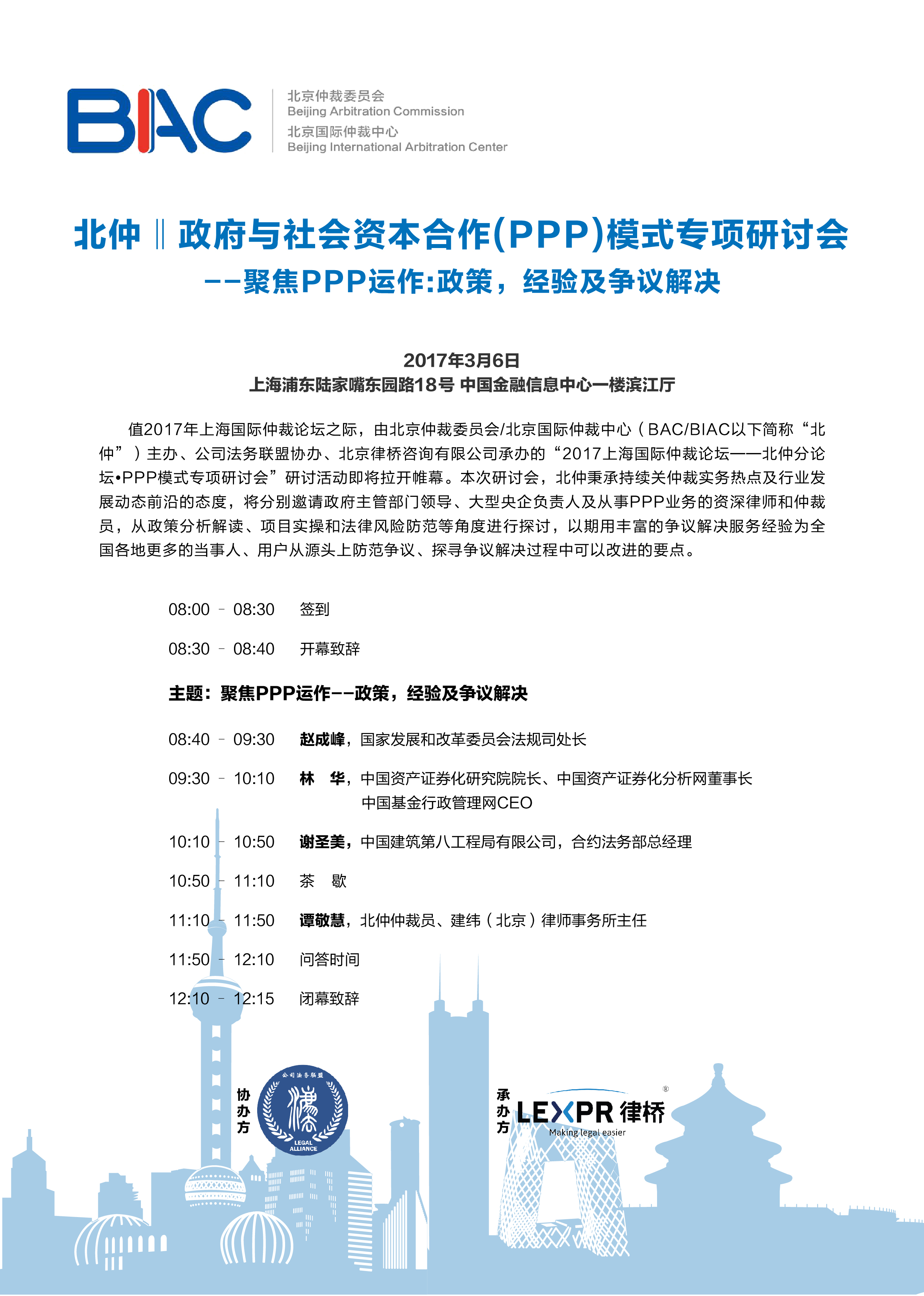 北京仲裁委员会/北京国际仲裁中心(Beijing Arbitration Commission / Beijing International Arbitration Center,简称北仲)将于2017年3月6日上午在上海浦东陆家嘴东园路18号中国金融信息中心一楼滨江厅举办北仲“政府与社会资本合作(PPP)模式”专项研讨会。