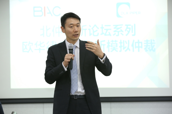 在模拟仲裁开始之前,欧华律师事务所合伙人、香港诉讼及合规部负责人、国际仲裁亚洲区负责人杨大明律师对国际商事仲裁中的庭审程序、案件的事实背景以及普通法下的合约解释(interpretation of contracts )、禁反言(estoppel)概念作了简要介绍。就庭审程序而言,杨大明律师强调了律师在开庭陈词和结案陈词应当解析争议案件焦点并回应对方代理人的观点,避免简单重复已提交的书面陈词。此外,通过比较大陆法系国家和普通法系国家对证人证言的不同态度,杨大明律师介绍了国际商事仲裁中主流的融合了普通法系和大陆法系特征的《IBA国际仲裁取证规则》,指出对事实证人的盘问意在证明书面证据及其形成的证据链的可靠性。就案件的事实背景以及两个普通法概念,杨大明律师围绕两个争议焦点对案件事实作出简要介绍,并将合约解释、禁反言的概念融入到案件争议焦点之中。