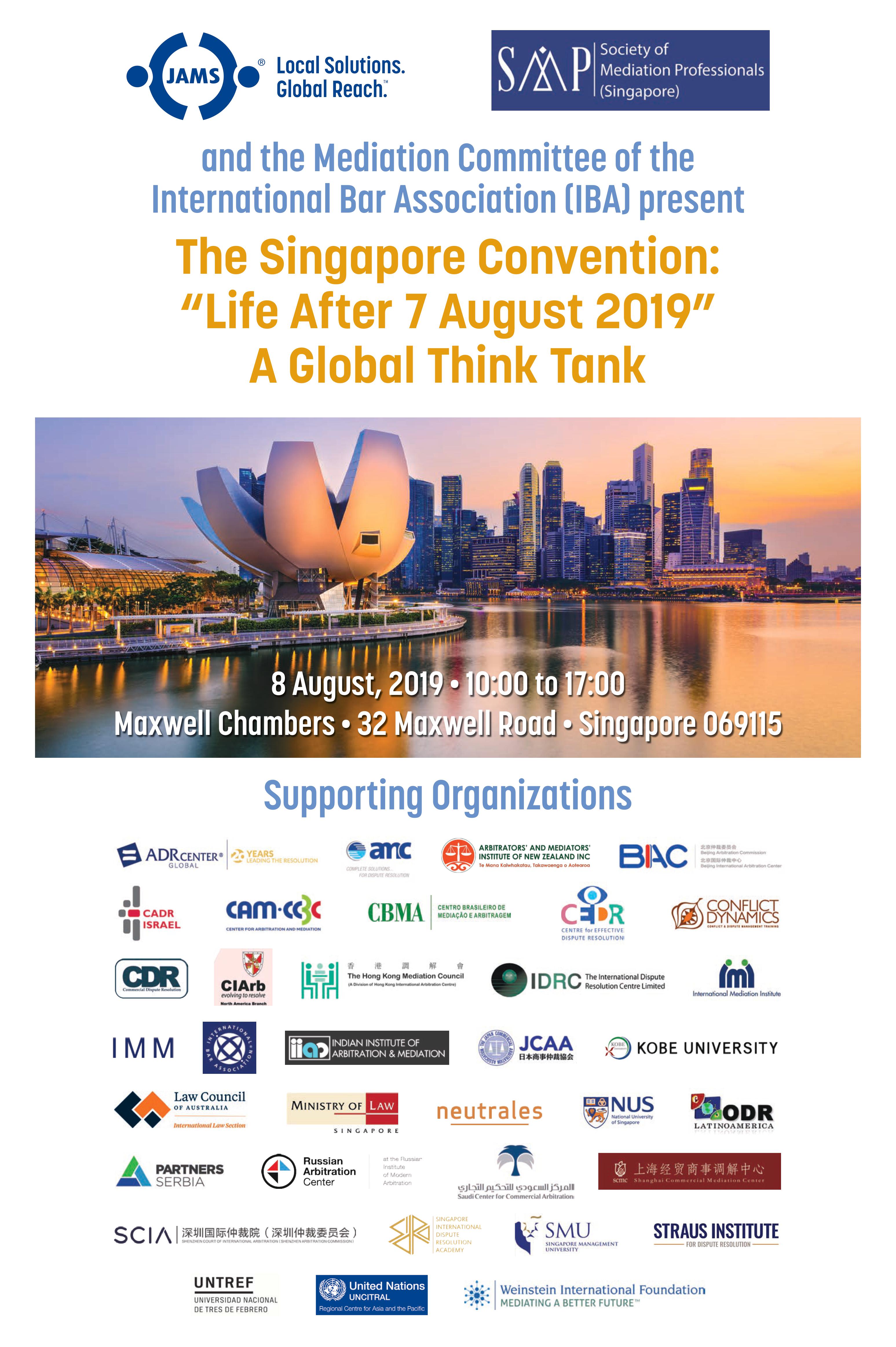 "The Singapore Convention: Life After 7 August 2019—A Global Think Tank"将于2019年8月8日(星期四)在新加坡举行。此次研讨会适逢《联合国关于调解所产生的国际和解协议公约》开放签署,研讨议题将围绕《联合国关于调解所产生的国际和解协议公约》进行。本次研讨会由美国司法仲裁调解服务有限公司(JAMS)、新加坡调解人专业协会(The Society of Mediation Professionals)以及国际律师协会调解专业委员会(The Mediation Committee of IBA)联合举办,北京仲裁委员会/北京国际仲裁中心(BAC/BIAC)作为支持机构参与。