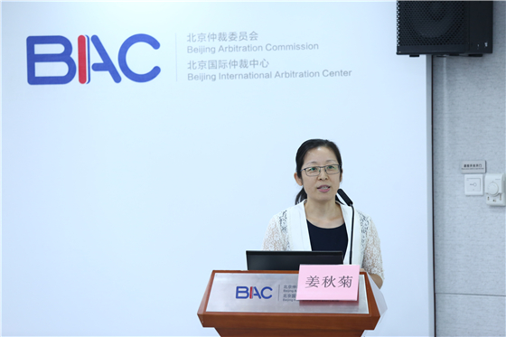 研讨会分为两个环节。第一环节的主题为“国内仲裁收费制度的前世今生——兼评北仲新收费标准”。该环节由北仲一处处长姜秋菊女士做主题发言,姜秋菊处长从北仲新收费标准出台的背景、特点和未来的发展趋势三个方面深入地介绍了北仲的新收费标准。