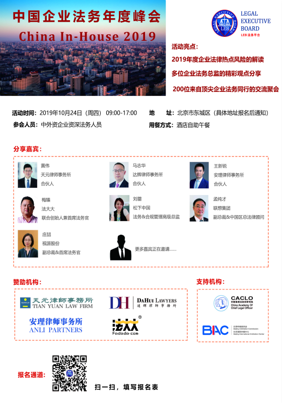 欢迎参加“中国企业法务年度峰会(China In-House 2019)”