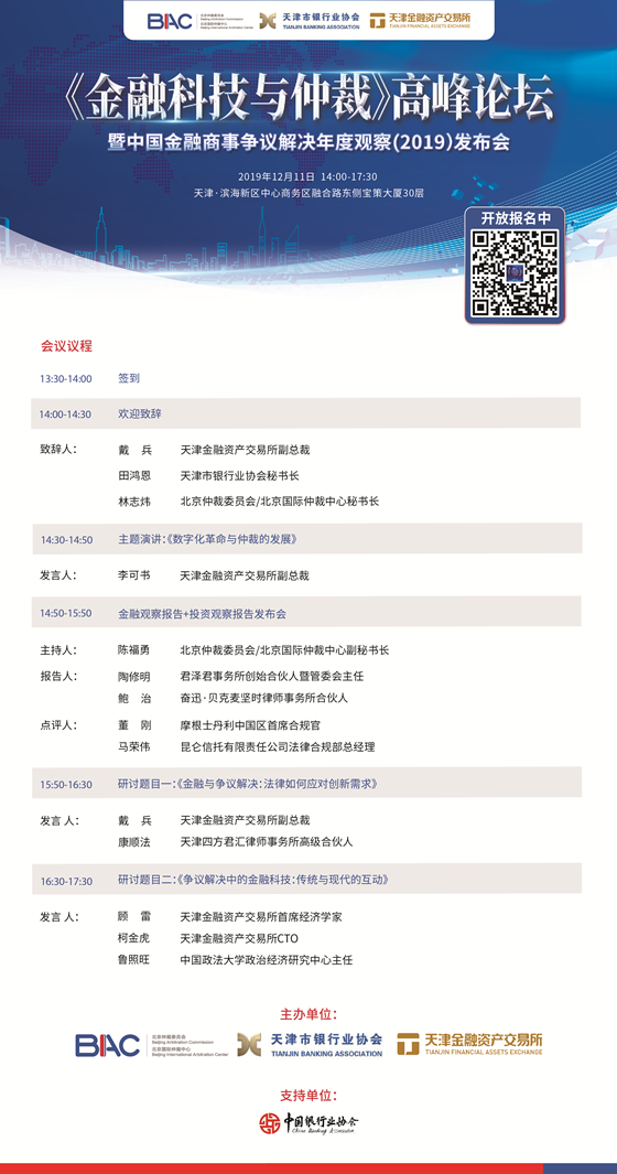 面对着不断复杂金融交易结构和日益创新的金融交易方式,争议解决行业如何适应新的形势,新的要求,如何在保障交易安全和鼓励金融创新之间找到平衡点,如何利用不断出现的科技手段帮助争议解决,提高争议解决的质量和效力,特别是重要性日益凸显的仲裁,如何利用其专业性来弥补法律的滞后性已经成为了金融行业和争议解决行业共同关心的问题。北京仲裁委员会/北京国际仲裁中心(以下简称北仲)联合天津市银行业协会和天津金融资产交易所举办《金融科技与仲裁》研讨会,旨在通过邀请争议解决行业和金融行业从业人员,从各自视角展开对话,共话金融争议解决的发展。同时,在研讨会上,北仲还将结合《中国商事争议解决年度观察(2019)》中的投资与金融两个篇章进行发布,由行业专家结合其自身深厚的专业功底和丰富的实践经验,解读金融及投资争议解决的现状和发展。