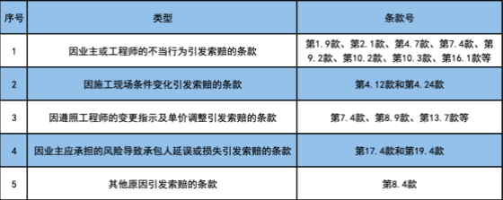 举例而言,在《FIDIC施工合同条件》(1999年版)中,对应于第20.1款索赔期限条款规定了诸多具体的索赔条款,主要包括: