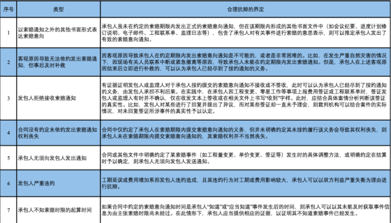 结合前述对索赔期限条款适用限制的论述,在审判实践中,裁判机构有必要对承包人可能提出的抗辩进行重点审查。“合理抗辩”的典型类型如下表(不完全列举)所示: