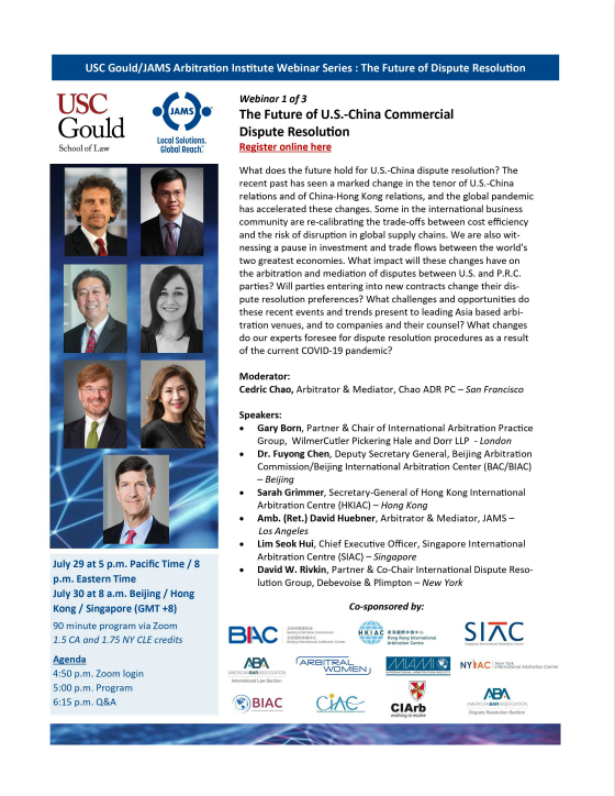 2020年7月30日上午8时(北京时间),USC与JAMS将共同举办“中美争议解决的未来”线上研讨会,北京仲裁委员会/北京国际仲裁中心作为本次活动的支持机构诚邀您的参与,会议注册请点击此处。